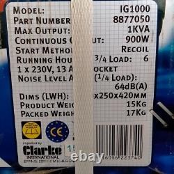 4 stroke petrol engine with'Eco Throttle' engine system (keeps fuel consumption and noise to a minimum). 2.7 litre fuel tank capacity. Noise level of 64db at 7 metres (1/4 load). Cut out protection systems for circuit overload. The Clarke IG1000 is ideal for providing a ready source of power when mains electricity is not available when caravaning, camping or on a boat.