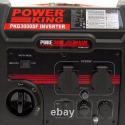 Wolf Petrol Inverter Generator 2000w 2.5KVA 3.5HP 4 Stroke. Inverter Generator PowerKing Petrol Power Generator 2800W 3.5kVA Camping Outdoor. The PowerKing 2800w Petrol Inverter Generator (PKG3000SF) delivers reliable and efficient power, making it an ideal choice for a variety of uses, from outdoor activities to backup power during outages. With a maximum output of 2800w (3.5 kVA) and a rated output of 2500w, this generator provides stable power for sensitive electronics, appliances, and tools. Equipped with a recoil start system and a durable 4-stroke petrol engine, this generator is built for easy operation and dependable performance. It features a 230V AC socket, a 12V DC socket, and two USB-A ports, allowing you to charge or power multiple devices simultaneously. With a 12-litre fuel tank and safety features like overload protection and low oil shutdown, the PKG3000SF offers long-lasting performance with added peace of mind. Its anti-vibration feet enhance stability during operation, while its compact design and 29kg weight make it easy to transport. Despite its power, it operates at a relatively low noise level of 65 dB(A), making it suitable for use in a wide range of environments. Key Features: // Powerful Output: Provides a maximum output of 2800w (3.5 kVA) and a rated output of 2500w, ideal for running appliances, tools, and sensitive electronics. // Versatile Sockets: Features 1 x 230V AC socket, 1 x 12V DC socket, and 2 x USB-A ports, allowing for simultaneous powering of various devices. // Fuel Efficient: Equipped with a 12-litre fuel tank for extended run times, perfect for longer use without frequent refuelling. // Reliable 4-Stroke Engine: Includes a robust 4-stroke petrol engine with a recoil start system for consistent and efficient performance. // Safety Features: Built-in overload protection and low oil shutdown safeguard the engine and connected devices, ensuring safe operation. // Portable Design: Weighing 29kg with compact dimensions and anti-vibration feet for easy transport and stable operation.// Low Noise: Operates at 65 dB(A), making it quiet enough for use in residential areas, campsites, and other noise-sensitive environments. 3.5 kVA / 2800w. 1 x 230V 10.9A (AC), 1 x 12V 5A (DC) & 2 x 5V 2.1A (USB-A).