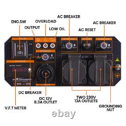 Provide clean power : Inverter technology generates clean sine waves to provide safe, high-quality power for sensitive devices without affecting their useful life. Can directly charge phones, laptops, cameras and other digital devices. Powerful generator : Peak 3500w, rated 3200w and up to 8.5 hours (25%-Load)runtime Multiple Outlets :2x 230V 13 AC Outlets, 1x 12V DC Outlets. (Only use AC outlets to charge a battery).