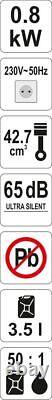 Type de carburant : essence sans plomb avec huile pour moteurs à deux temps. Performance maximale du générateur : 880 W, performance continue : 800 W, 0,75 l / h.
