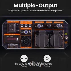 Multiples prises : 2x 230V 13 prises AC, 1x 12V prises DC. (Utiliser uniquement les prises AC pour charger une batterie). Léger : Seulement 26 kg, facile à transporter et à ranger. Alerte LED : Surcharge, faible niveau d'huile et alerte LED prête à la sortie.