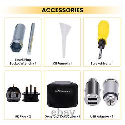 Certification : Certifié UKCA/CE, conformité EURO V. 1 x Générateur à courant inverse 1 x Manuel du propriétaire 1 x Clé à bougie 1 x Entonnoir à huile 1 x Tournevis 2 x Prise UK 1 x Housse de protection pour générateur 1 x Adaptateur USB. Tous les générateurs à courant inverse sont entièrement testés en usine et peuvent contenir de petites quantités d'huile ou de carburant résiduels. Altitude applicable : 5000 pieds ou moins. Plus de 5000 pieds affectera sa stabilité et sa puissance.Température ambiante de fonctionnement optimale du générateur : 77 °F. Température de fonctionnement normale : 5 °F à 104 °F.